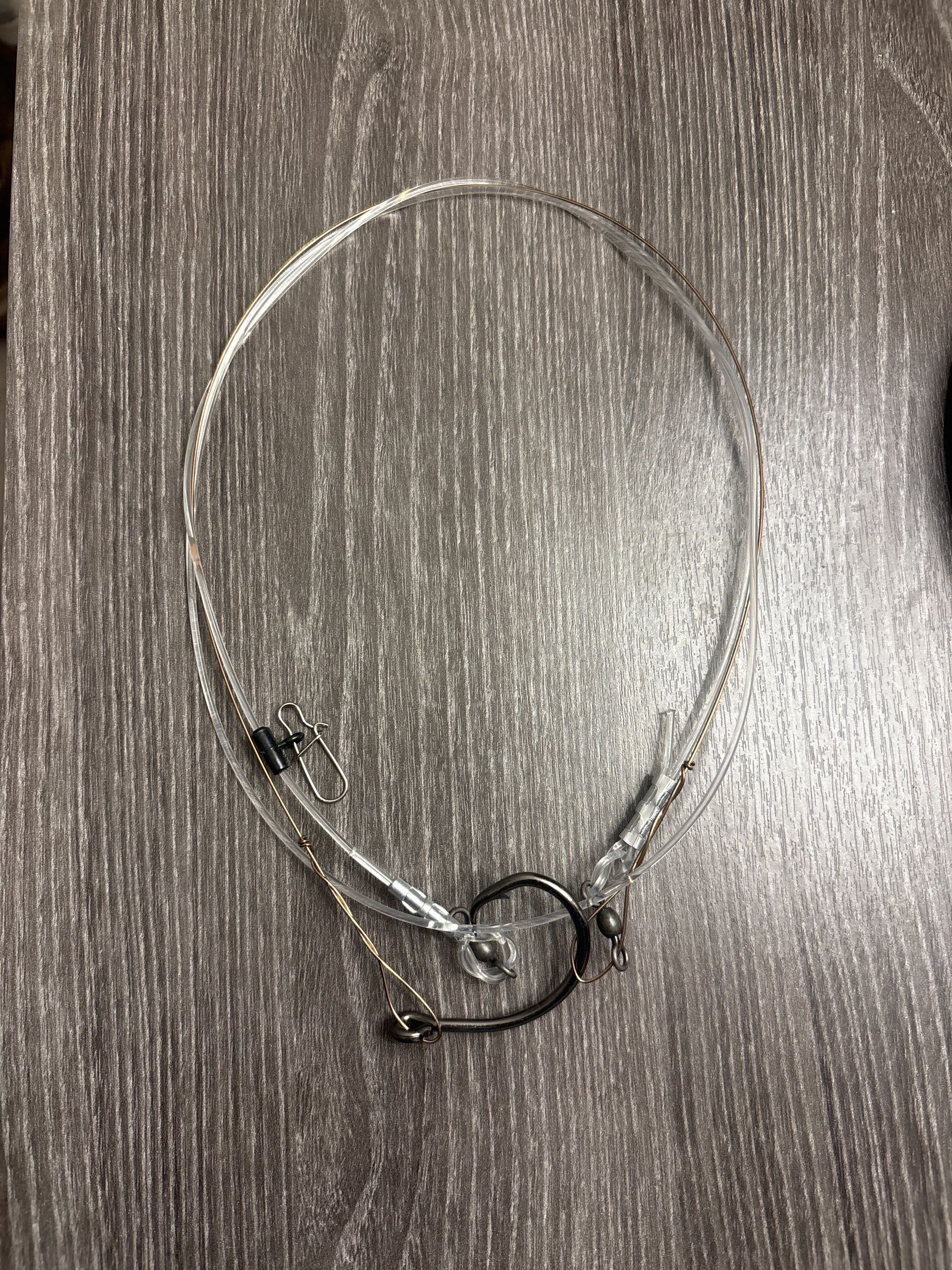 this rig is made with high quality materials and quality inspected. we run a 10/0 mustad 3x strong circle hook to #15 wire to a 475 lb swivel attached to 300 lb mono with a snap on weight slider ended with a 475 lb swivel.